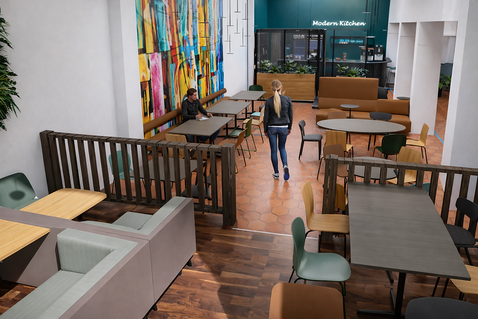 Hier verbinden sich moderne Arbeitsplätze mit einem integrierten Workcafé und unterschiedlichen Zonen für konzentriertes Arbeiten, Austausch oder kreativen Pausen.
